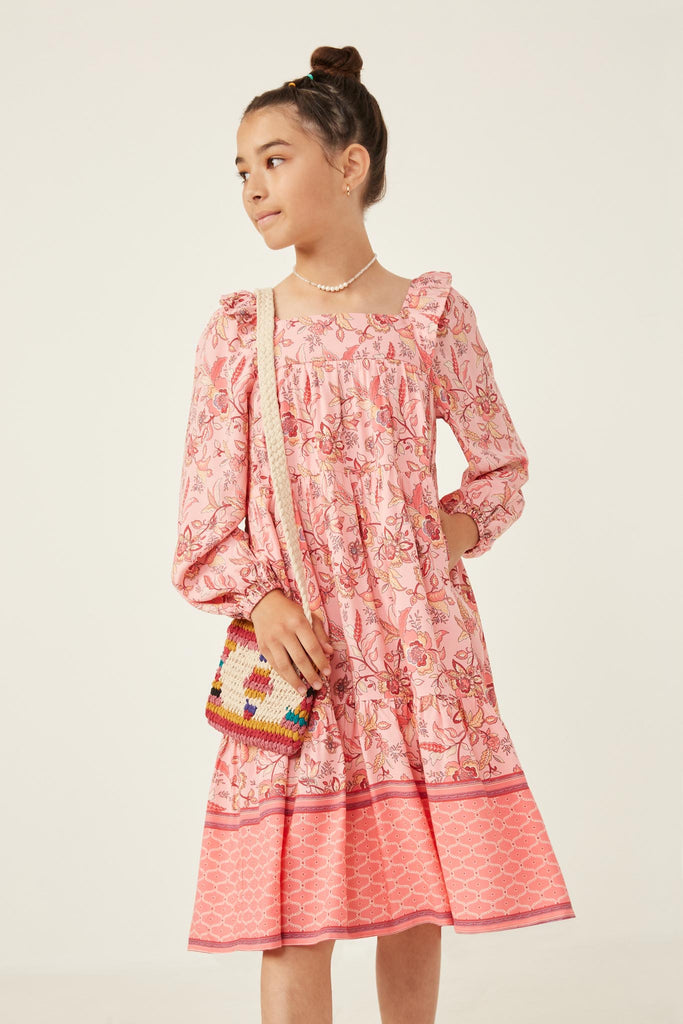 Our Border Print Long Sleeve Ruffle Shoulder Dress Features:
