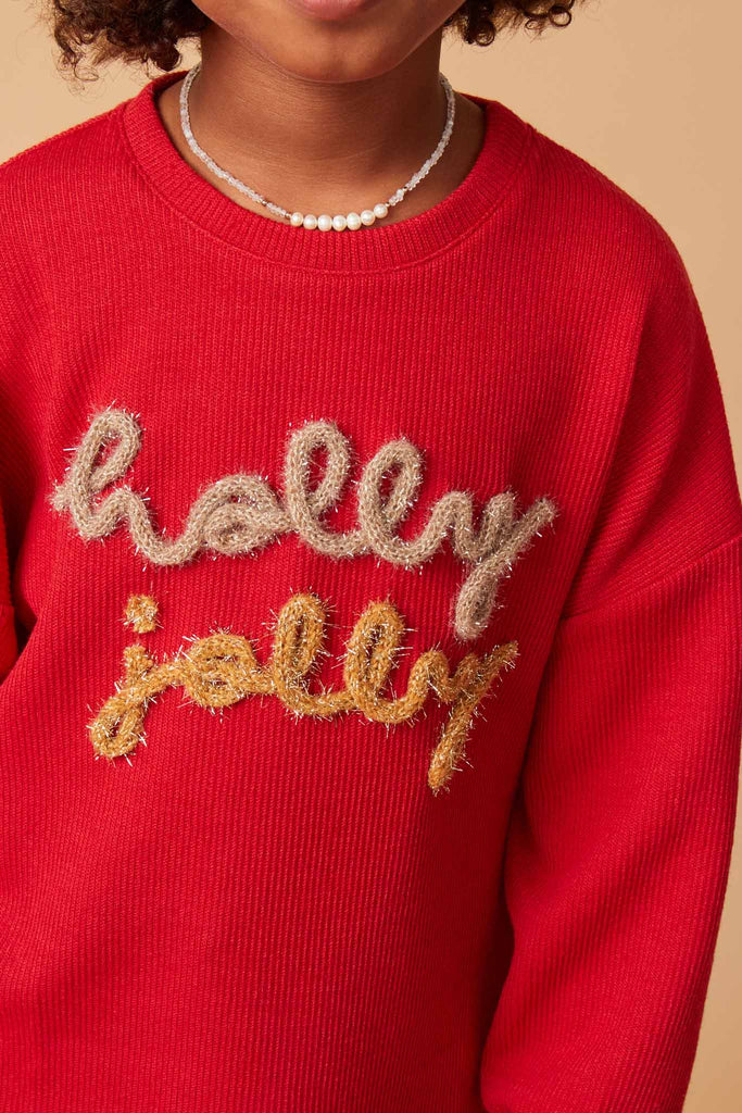 Our Handknit Tinsel Holly Jolly Verbiage Ribbed Knit Top Features:
