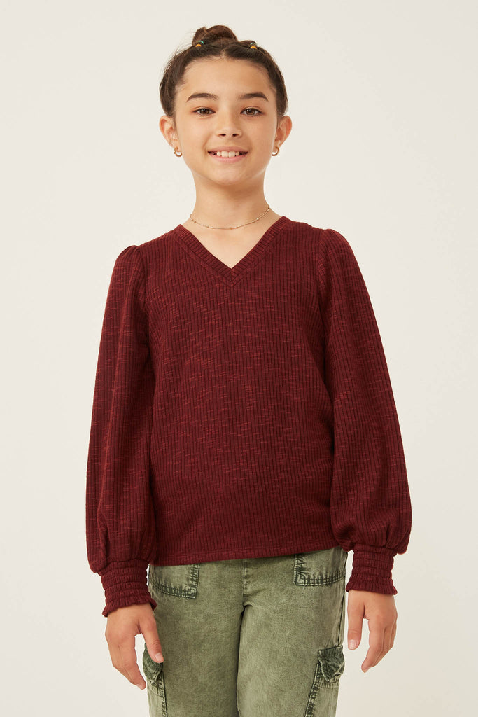 Our Marled V Neck Smocked Cuff Ribbed Knit Top Features: