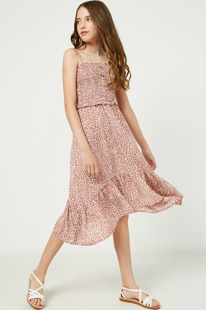 Tie Shoulder Smocked Ruffle Detail Midi Dress