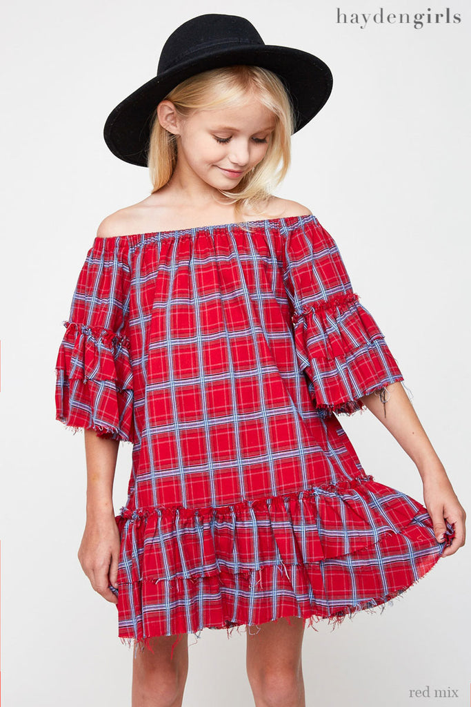 Our Off Shoulder Plaid Ruffle Dress Features: