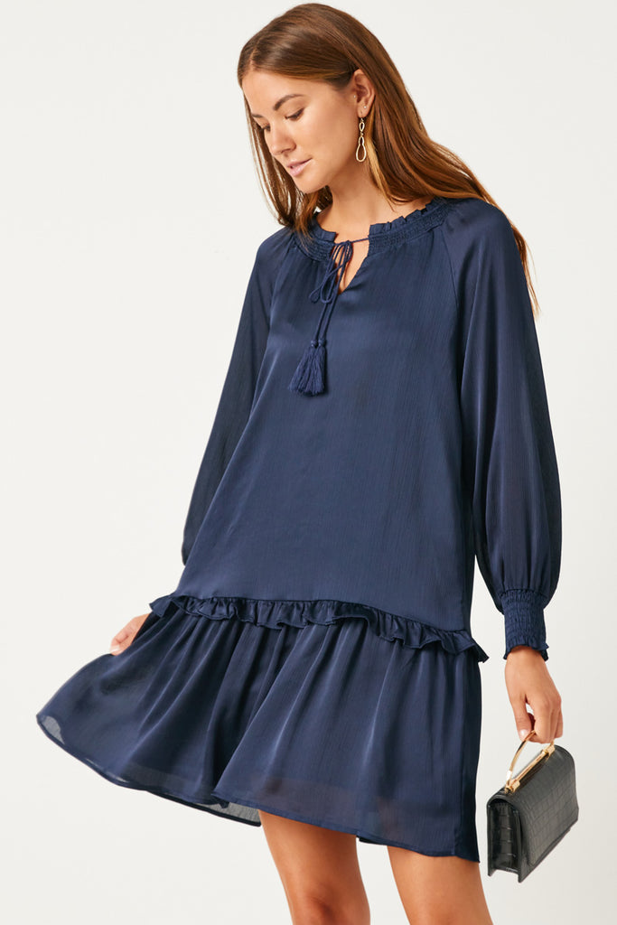 Our Satin Look Smocked Cuff Tie Neck Dress Features: