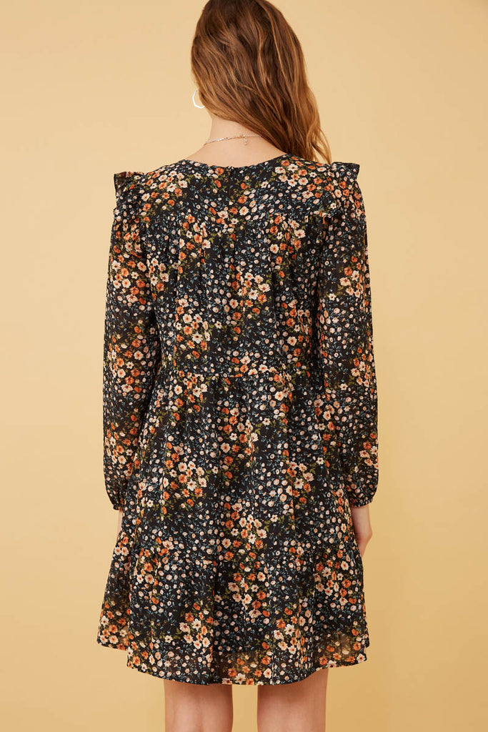 Womens Floral Print Ruffle Shoulder Long Sleeve Dress