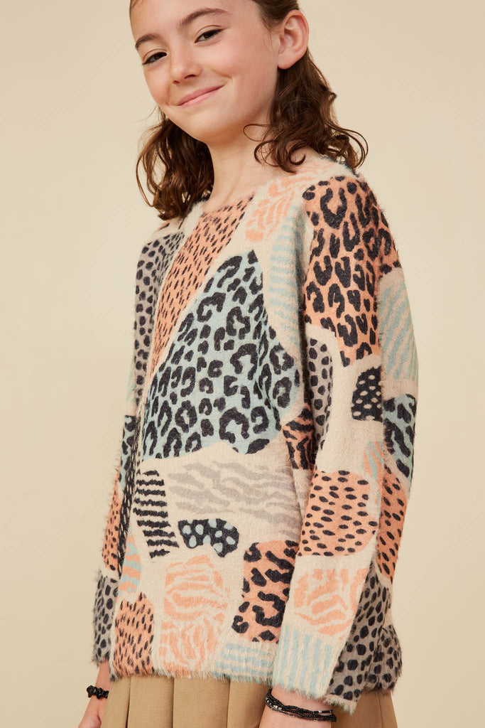 Our Fuzzy Textured Abstract Leopard Sweater Features: