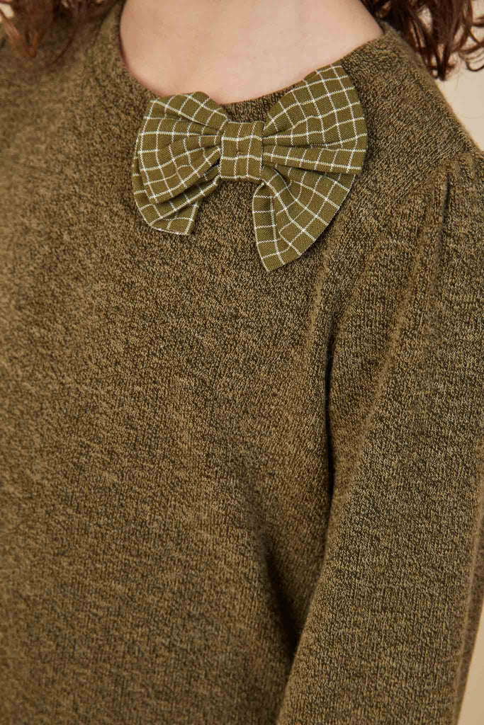 Our Contrast Plaid Bow Textured Knit Top Features:
