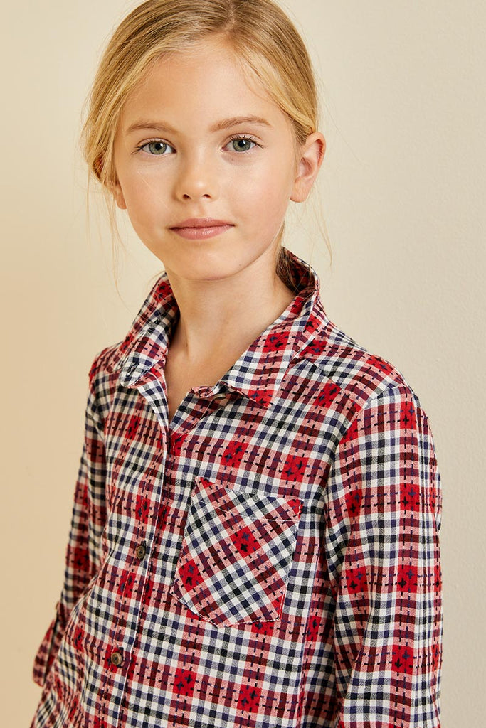 Our Embroidered Plaid Button-Down Top Features: