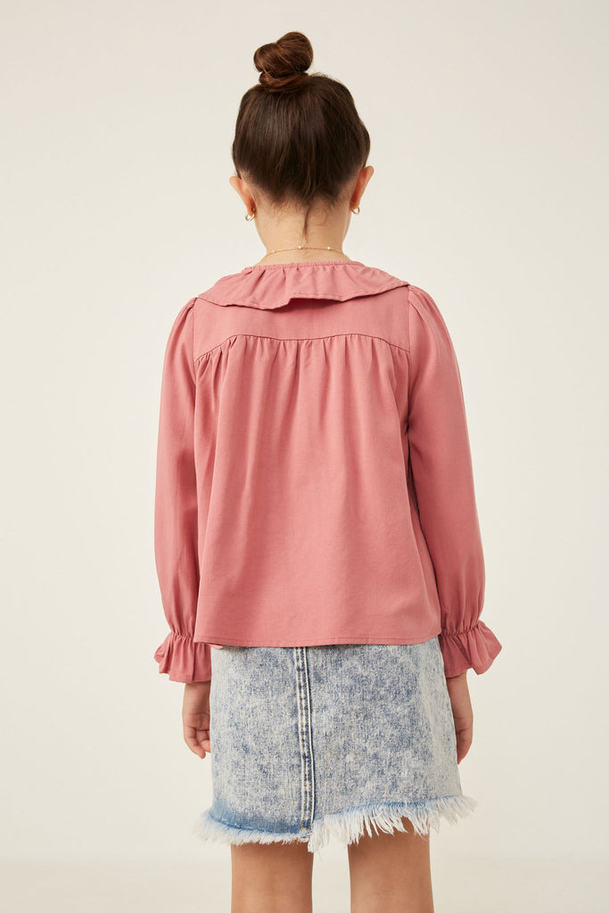 Our Exaggerated Ruffle Placket Long Sleeve Top Features:
