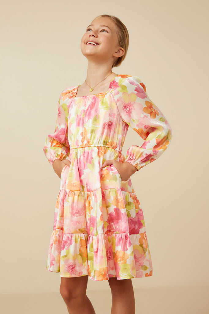 Our Lurex Floral Square Neck Peasant Sleeve Dress Features: