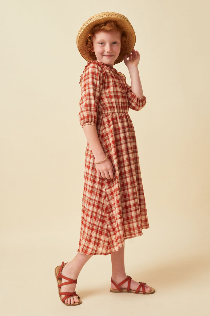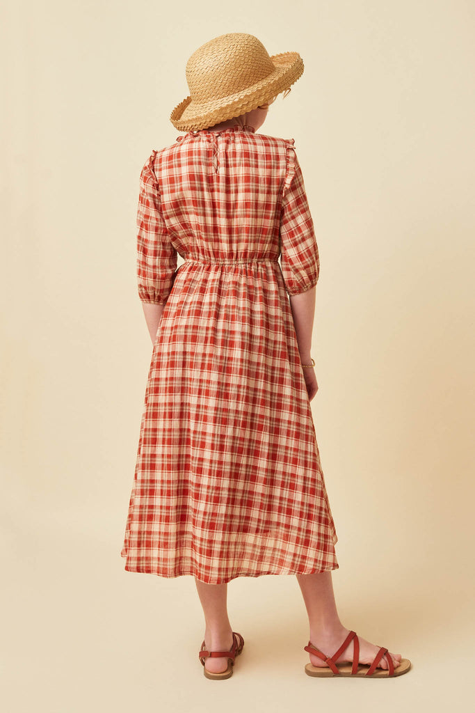 Ruffle Neck Long Elbow Sleeve Plaid Dress